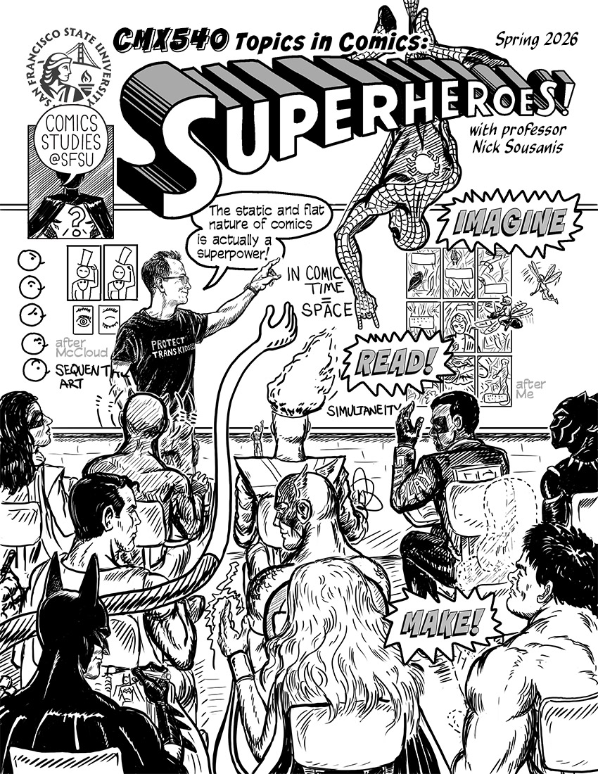 Nick Sousanis is an Eisner-winning comics author and an associate professor of Humanities & Liberal Studies at San Francisco State University, where he started and runs a Comics Studies program. He received his doctorate in education at Teachers College, Columbia University in 2014, where he wrote and drew his dissertation entirely in comic book form. Titled Unflattening, it argues for the importance of visual thinking in teaching and learning, and was published by Harvard University Press in 2015. Unflattening received the 2016 American Publishers Awards for Professional and Scholarly Excellence (PROSE Award) in Humanities, the Lynd Ward Prize for best Graphic Novel of 2015, and was nominated for an Eisner Award for Best Scholarly/Academic work. To date, Unflattening has been translated into French, Korean, Portuguese, Serbian, Polish, Italian, and Chinese (details here).